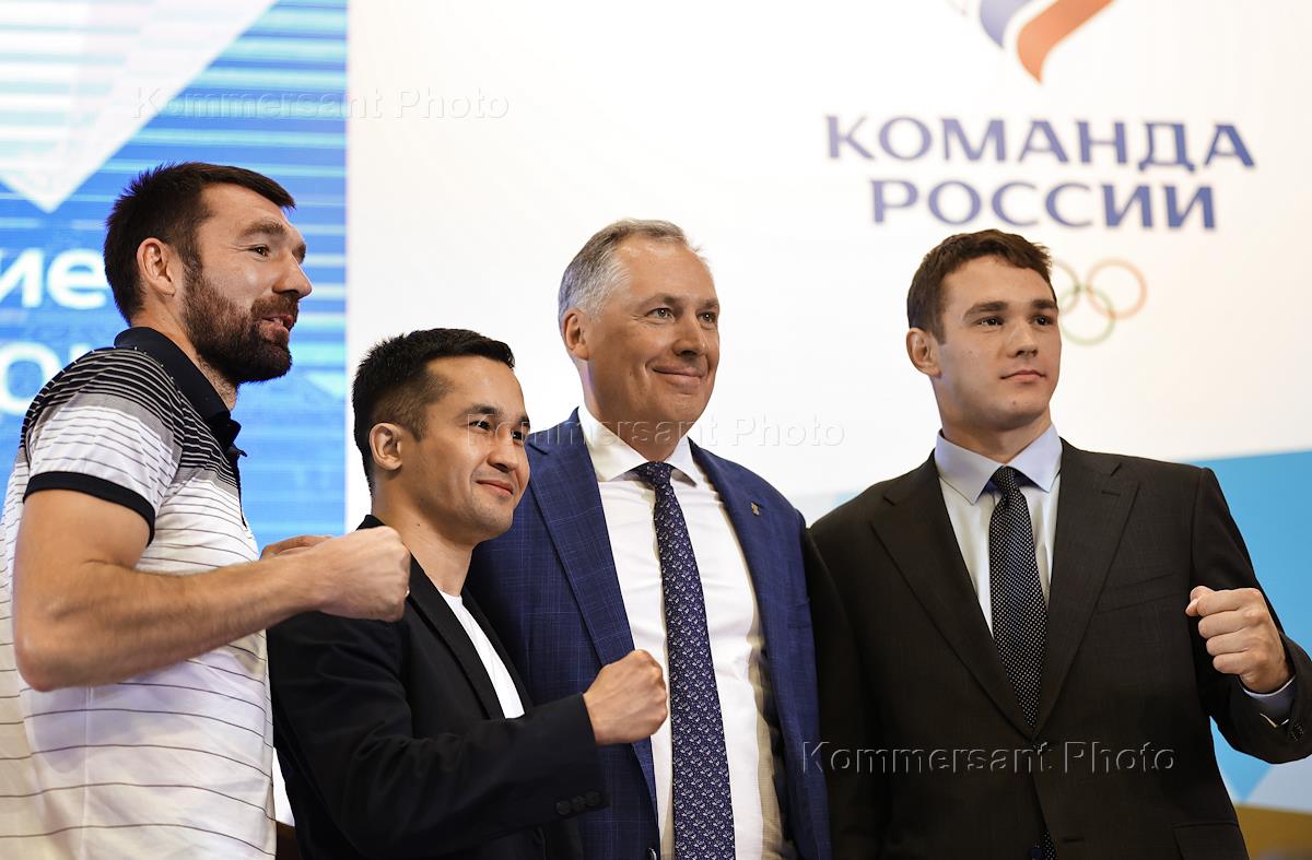 Расширенное заседание Комиссии спортсменов Олимпийского комитета России (ОКР) в штаб-квартиры ОКР. Справа налево: президент ОКР Станислав Поздняков, помощник президента России Игорь Левитин и вице-президент ОКР Владимир Кожин во время заседания.