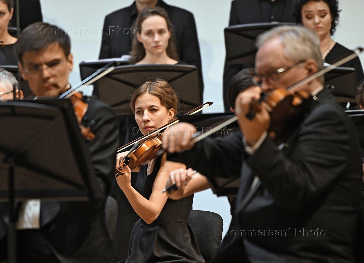 Произведение композитора Иоганнеса Брамса "Немецкий реквием" в исполнении Российского национального оркестра, вокального ансамбля Intrada и оперных певцов Альбины Латиповой и Владислава Сулимского в Концертном зале имени П.И. Чайковского. Музыканты оркестра во время концерта.