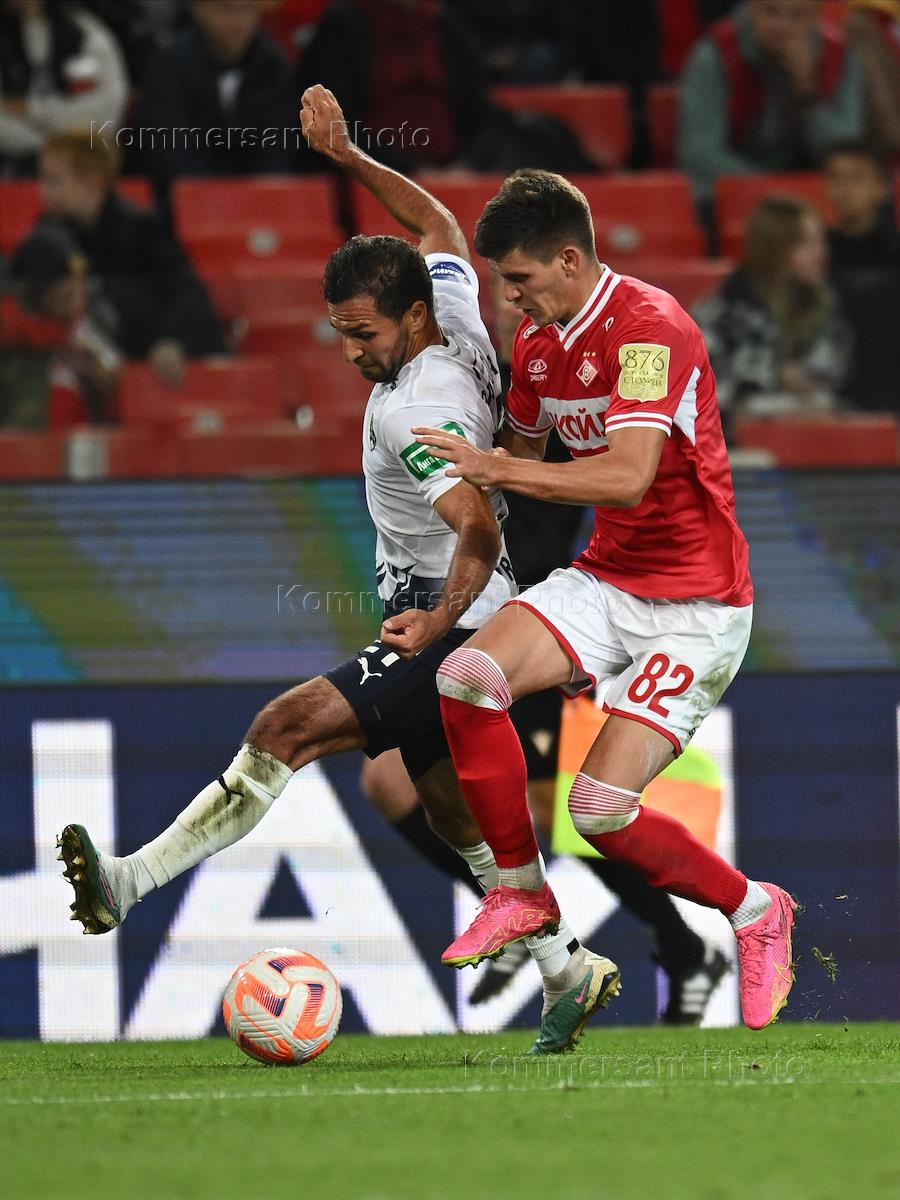 Russian Premier League (RPL). Russian Football Championship 2023/2024. Eighth round. Match between the teams "Spartak M" (Moscow) - "Sochi" (Sochi) at the Otkritie Bank Arena stadium. Sochi team player Martin Kramaric (right) and Spartak M team player Daniil Denisov (left) during the match.