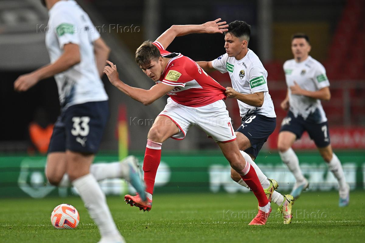 Российская Премьер-Лига (РПЛ). МИР - Чемпионат России по футболу 2023/2024. Восьмой тур. Матч между командами "Спартак М" (Москва) - "Сочи" (Сочи) на стадионе "Открытие Банк Арена". Игрок команды "Спартак М" Даниил Хлусевич (справа) во время матча.