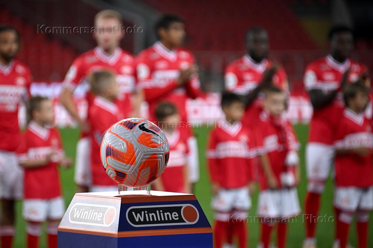 Russian Premier League (RPL). Russian Football Championship 2023/2024. Eighth round. Match between the teams "Spartak M" (Moscow) - "Sochi" (Sochi) at the Otkritie Bank Arena stadium. Genre photography. Soccer ball on a pedestal before the start of the match.