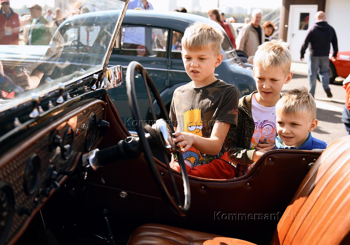 The final of the retro rally "Moscow Autumn" at the Northern River Station. Genre photography. Children look at the interior of the car.