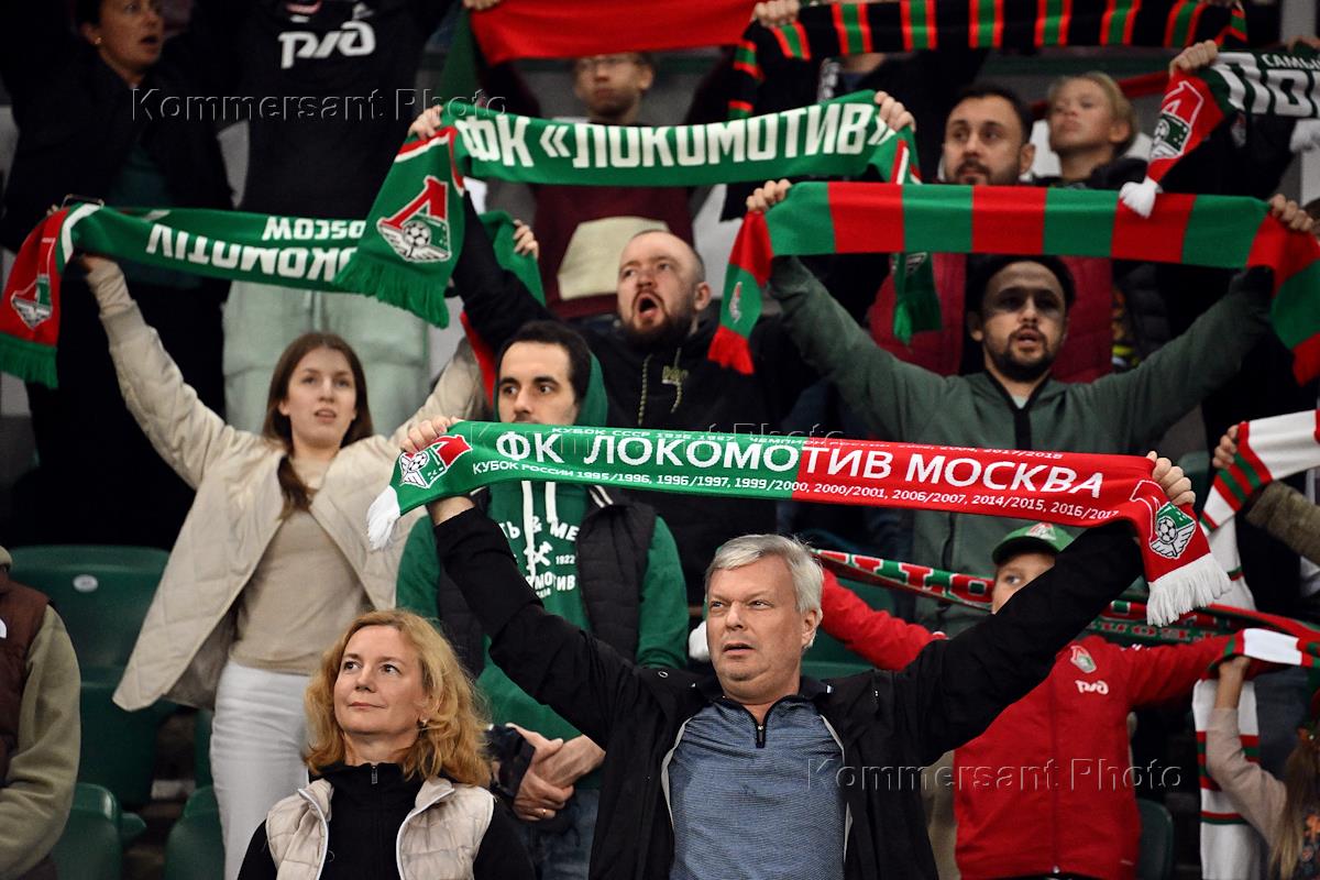 Российская Премьер-Лига (РПЛ). МИР - Чемпионат России по футболу 2023/2024. Восьмой тур. Матч между командами "Локомотив М" (Москва) - "Оренбург" (Оренбург) на стадионе "РЖД Арена". Болельщики команды "Локомотив М" на трибунах во время матча.