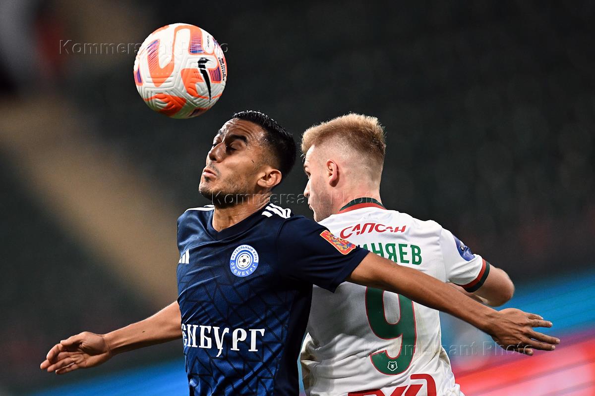 Российская Премьер-Лига (РПЛ). МИР - Чемпионат России по футболу 2023/2024. Восьмой тур. Матч между командами "Локомотив М" (Москва) - "Оренбург" (Оренбург) на стадионе "РЖД Арена". Игрок команды "Локомотив М" Артем Карпукас (слева) во время матча.