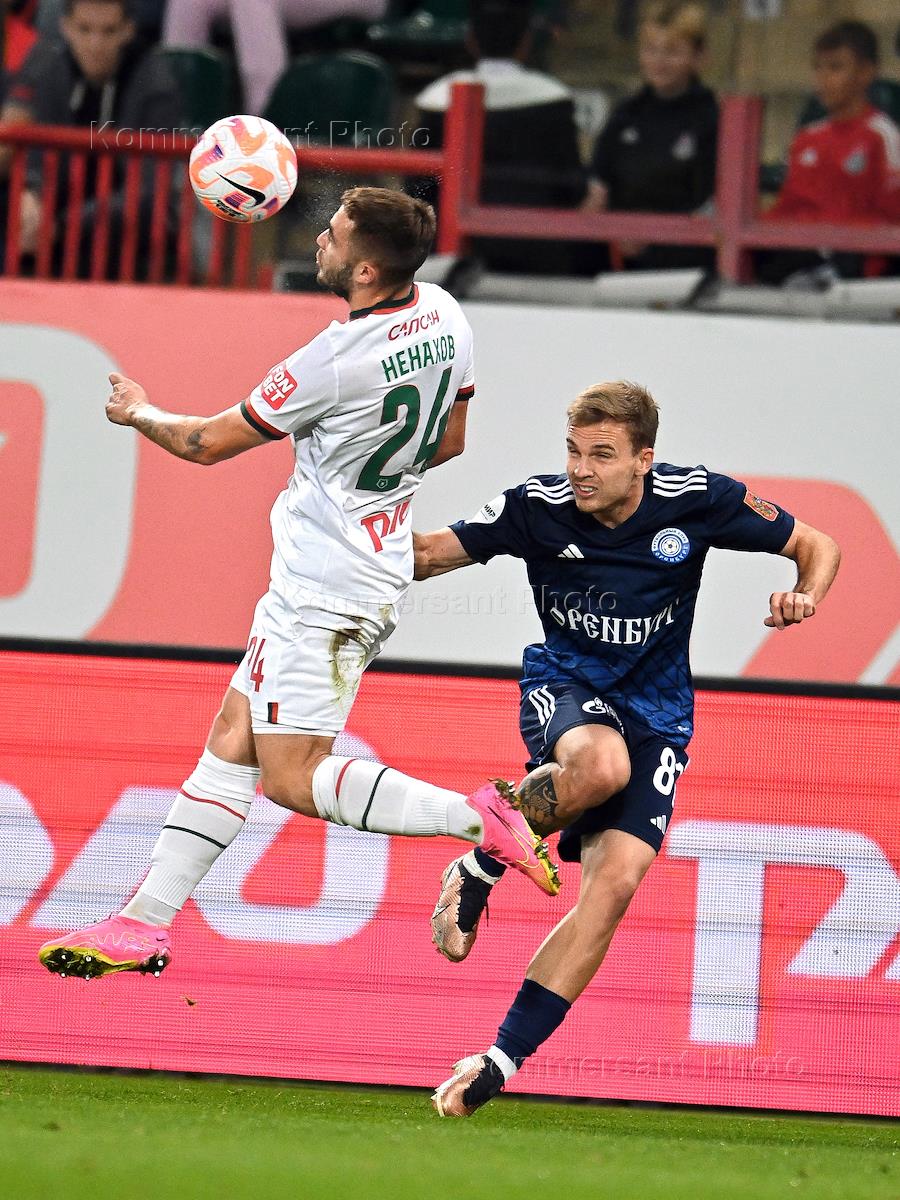Российская Премьер-Лига (РПЛ). МИР - Чемпионат России по футболу 2023/2024. Восьмой тур. Матч между командами "Локомотив М" (Москва) - "Оренбург" (Оренбург) на стадионе "РЖД Арена". Игрок команды "Локомотив М" Максим Ненахов (слева) и игрок команды "Оренбург" Максим Сидоров (справа) во время матча.