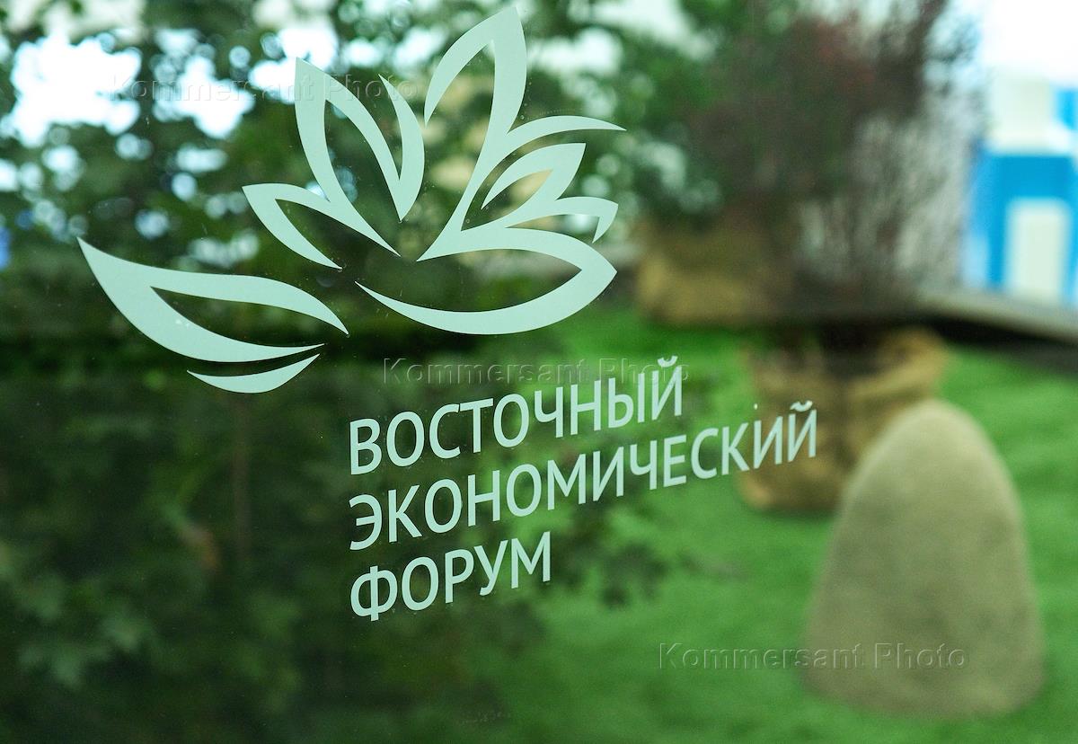 Eastern Economic Forum (EEF) 2023 on the territory of the Far Eastern Federal University (FEFU) on Russky Island. Genre photography. Forum logo on a glass fence.