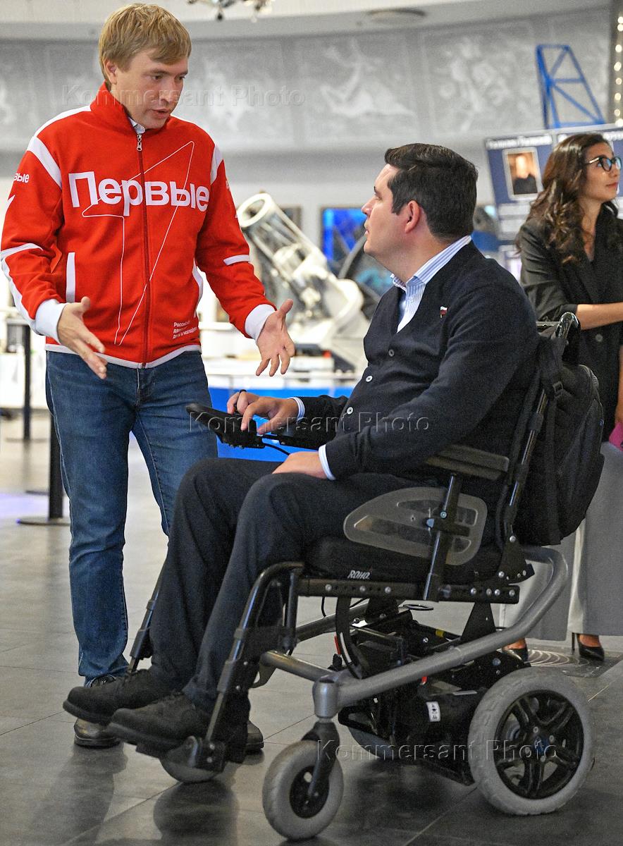 Церемония запуска Всероссийского проекта "Выбор Первых" в Московском планетарии. Председатель правления Российского движения детей и молодежи, заместитель министра науки и высшего образования России Григорий Гуров (слева) и заместитель председателя комитета Государственной думы России по молодежной политике Михаил Киселев (справа) во время церемонии.