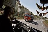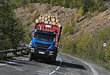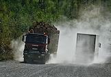 Участок Федеральной автомобильной дороги А-376 "Хабаровск - Лидога - Ванино - Комсомольск-на-Амуре". Жанровая фотография. Грузовой автомобиль с лесом кругляком во время движения по трассе.