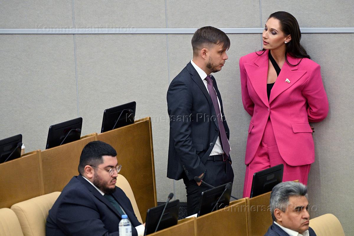 Пленарное заседание Государственной думы (ГД) России. Член комитета ГД России по труду, социальной политике и делам ветеранов Екатерина Стенякина (справа) и первый заместитель председателя комитета ГД России по контролю Михаил Романов (слева) во время заседания.