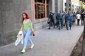 Ситуация в Ереване после обострения ситуации в Нагорном Карабахе. Протестная акция с требованием к правительству Армении признать независимость Карабаха и отставки премьер-министра Никола Пашиняна. Участница акции и сотрудники полиции у Дома правительства Армении на площади Республики. 19 сентября Министерство бороны Азербайджана сообщило, что Баку начал "антитеррористические мероприятия" локального характера в Карабахе для восстановления конституционного строя.