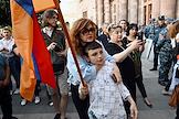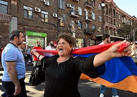 Ситуация в Ереване после обострения ситуации в Нагорном Карабахе. Протестная акция у Дома правительства Армении на площади Республики. Лидер блока "Мать Армения" Андраник Теванян (в центре) во время акции.