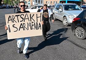 Ситуация в Ереване после обострения ситуации в Нагорном Карабахе. Протестная акция с требованием к правительству Армении признать независимость Карабаха и отставки премьер-министра Никола Пашиняна. Участник акции у Дома правительства Армении на площади Республики несет плакат с надписью "Арцах - это Армения!". 19 сентября Министерство бороны Азербайджана сообщило, что Баку начал "антитеррористические мероприятия" локального характера в Карабахе для восстановления конституционного строя.