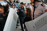 Ситуация в Ереване после обострения ситуации в Нагорном Карабахе. Протестная акция с требованием к правительству Армении признать независимость Карабаха и отставки премьер-министра Никола Пашиняна. Участница акции и сотрудники полиции у Дома правительства Армении на площади Республики. 19 сентября Министерство бороны Азербайджана сообщило, что Баку начал "антитеррористические мероприятия" локального характера в Карабахе для восстановления конституционного строя.