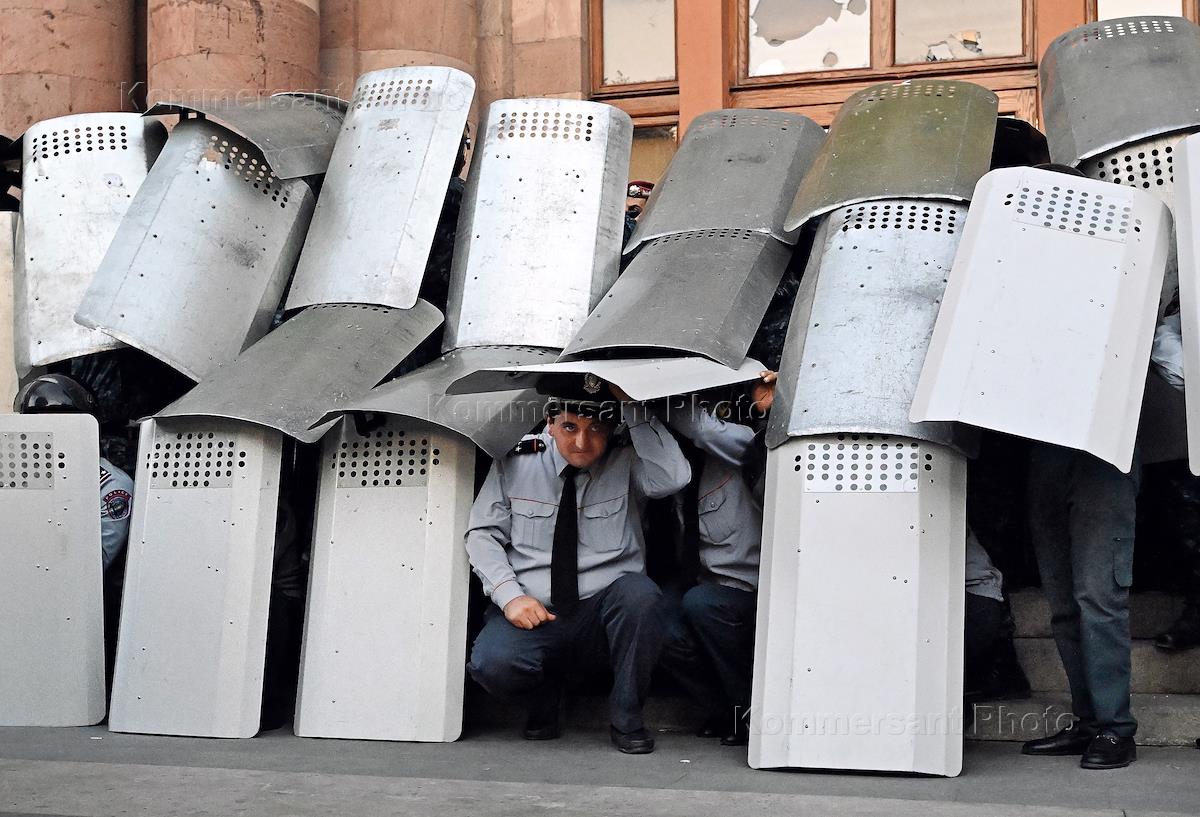 Ситуация в Ереване после обострения ситуации в Нагорном Карабахе. Протестная акция с требованием к правительству Армении признать независимость Карабаха и отставки премьер-министра Никола Пашиняна. Сотрудники полиции во время дежурства на акции у Дома правительства Армении на площади Республики. 19 сентября Министерство бороны Азербайджана сообщило, что Баку начал "антитеррористические мероприятия" локального характера в Карабахе для восстановления конституционного строя.
