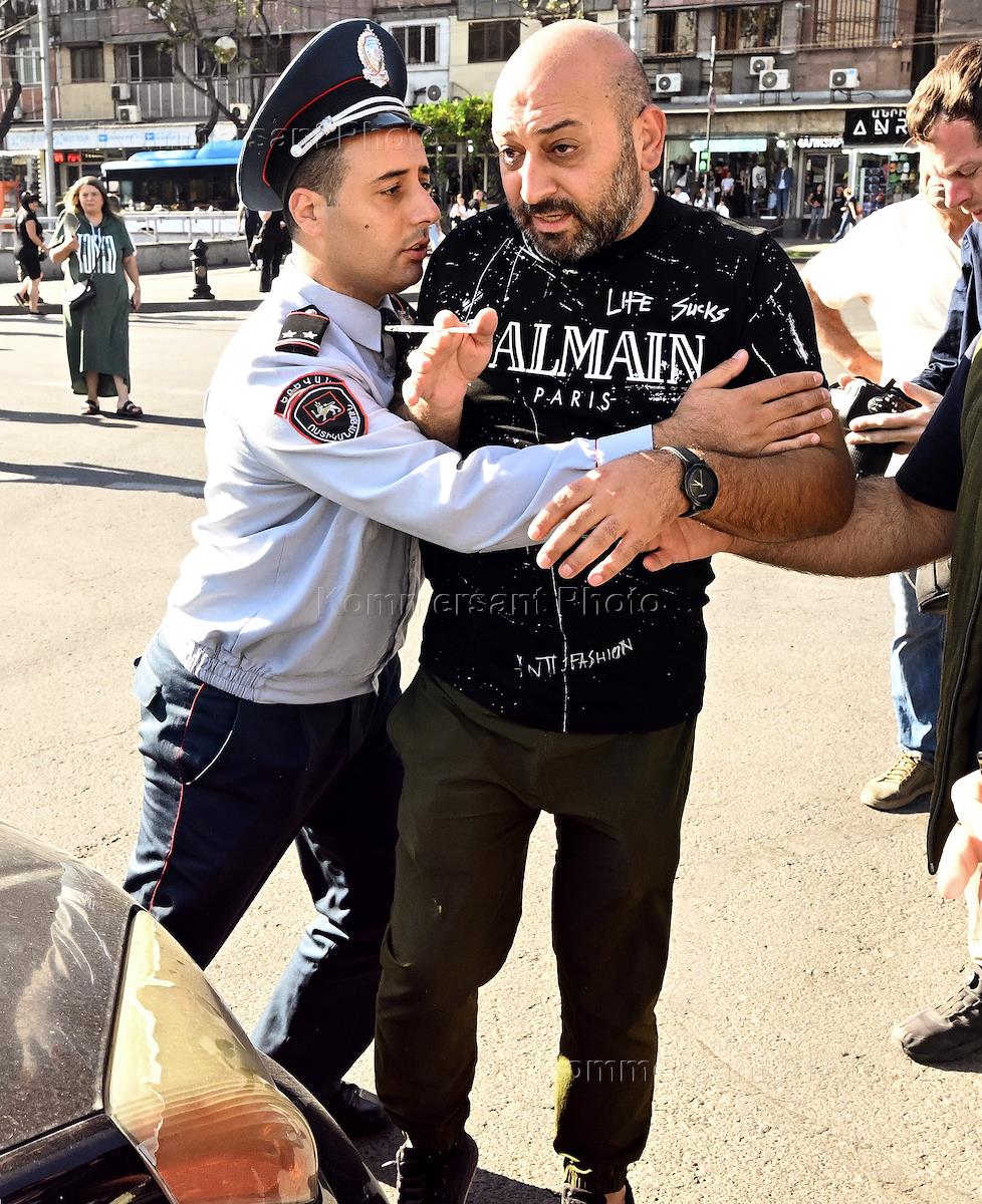 Ситуация в Ереване после обострения ситуации в Нагорном Карабахе. Протестная акция с требованием к правительству Армении признать независимость Карабаха и отставки премьер-министра Никола Пашиняна. Сотрудники полицииво время задержания участника акции у Дома правительства Армении на площади Республики. 19 сентября Министерство бороны Азербайджана сообщило, что Баку начал "антитеррористические мероприятия" локального характера в Карабахе для восстановления конституционного строя.