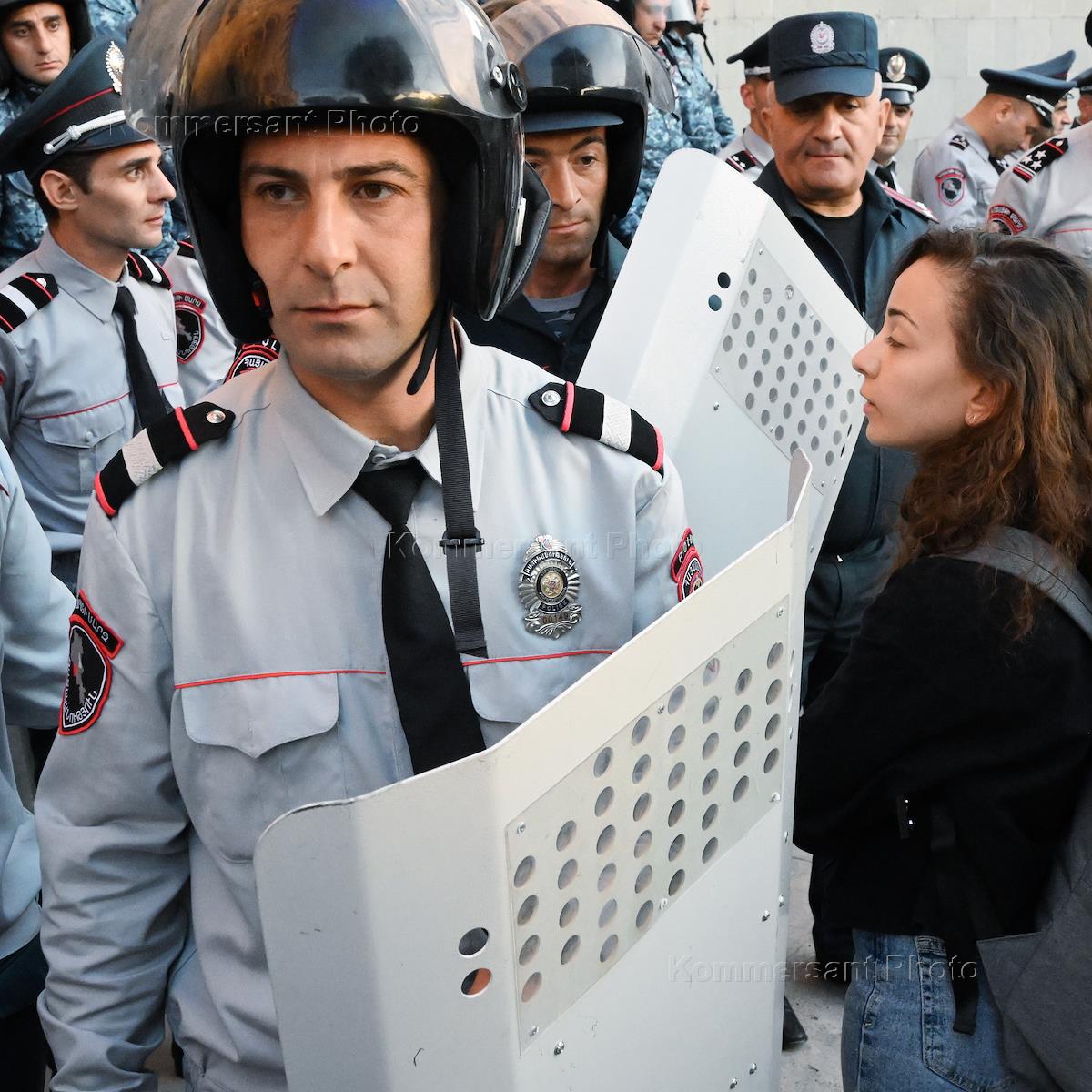 Ситуация в Ереване после обострения ситуации в Нагорном Карабахе. Протестная акция с требованием к правительству Армении признать независимость Карабаха и отставки премьер-министра Никола Пашиняна. Участница акции и сотрудники полиции у Дома правительства Армении на площади Республики. 19 сентября Министерство бороны Азербайджана сообщило, что Баку начал "антитеррористические мероприятия" локального характера в Карабахе для восстановления конституционного строя.
