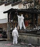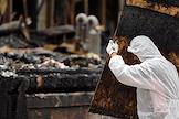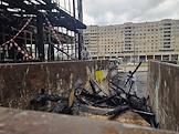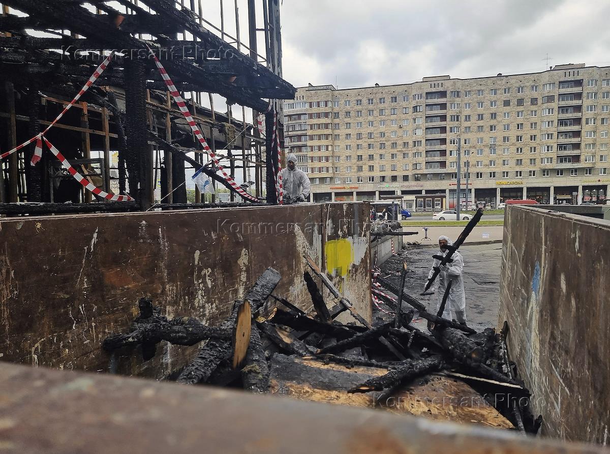 Демонтажные работы в частично сгоревшем здании бывшего кинотеатра "Слава" на углу проспекта Славы и Бухарестской улицы.