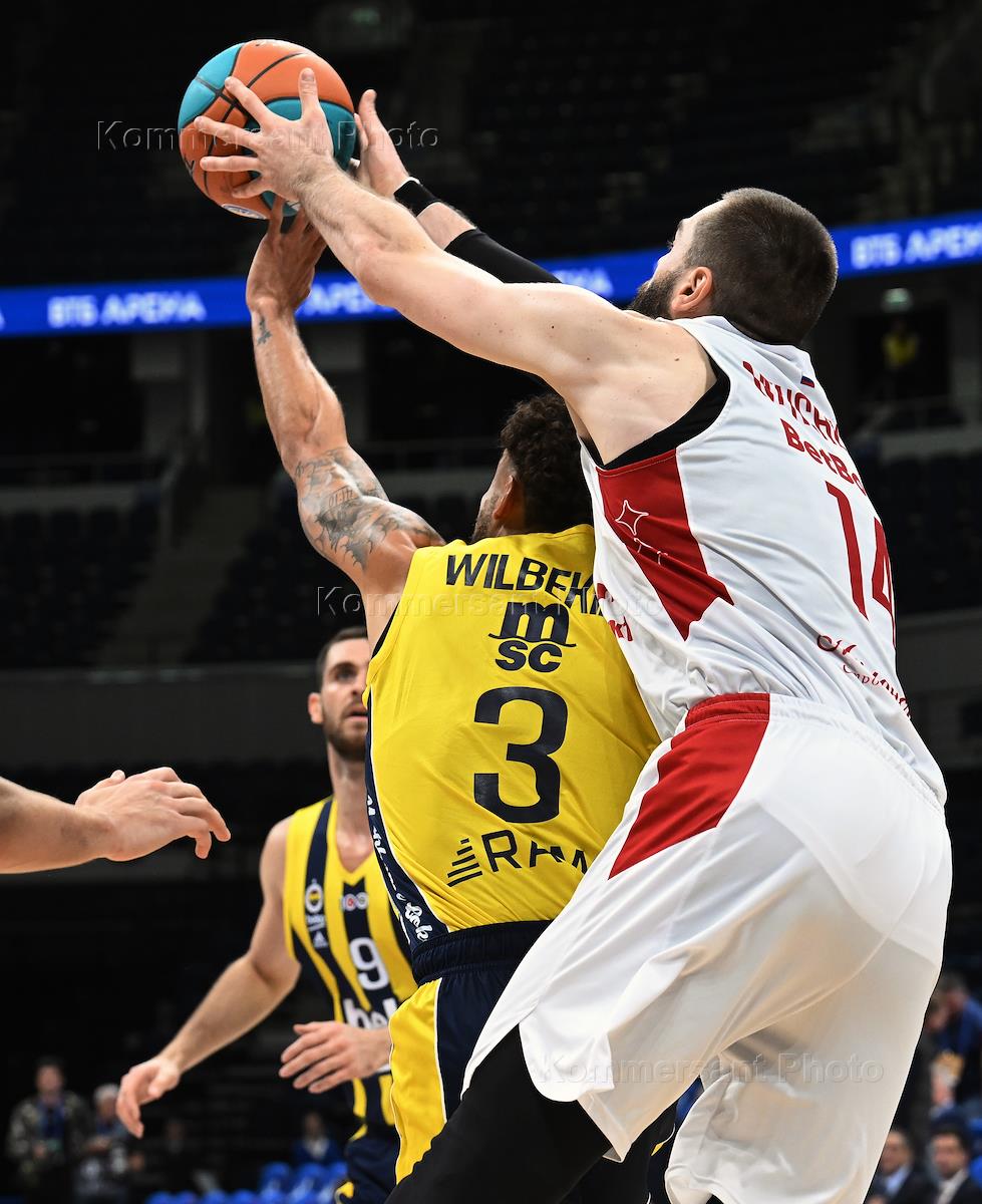 Суперкубок Единой лиги ВТБ на кубок имени А.Я.Гомельского. Матч между командами МБА (Россия) — "Фенербахче" (Турция) в спортивном комплексе "ВТБ Арене". Игрок команды МБА Евгений Минченко (справа) и игрок команды "Фенербахче" Скотти Уилбекин (в центре) во время матча.