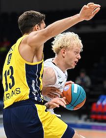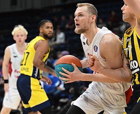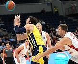 Суперкубок Единой лиги ВТБ на кубок имени А.Я.Гомельского. Матч между командами МБА (Россия) — "Фенербахче" (Турция) в спортивном комплексе "ВТБ Арене". Игрок команды МБА Андрей Лопатин (в центре) во время матча.