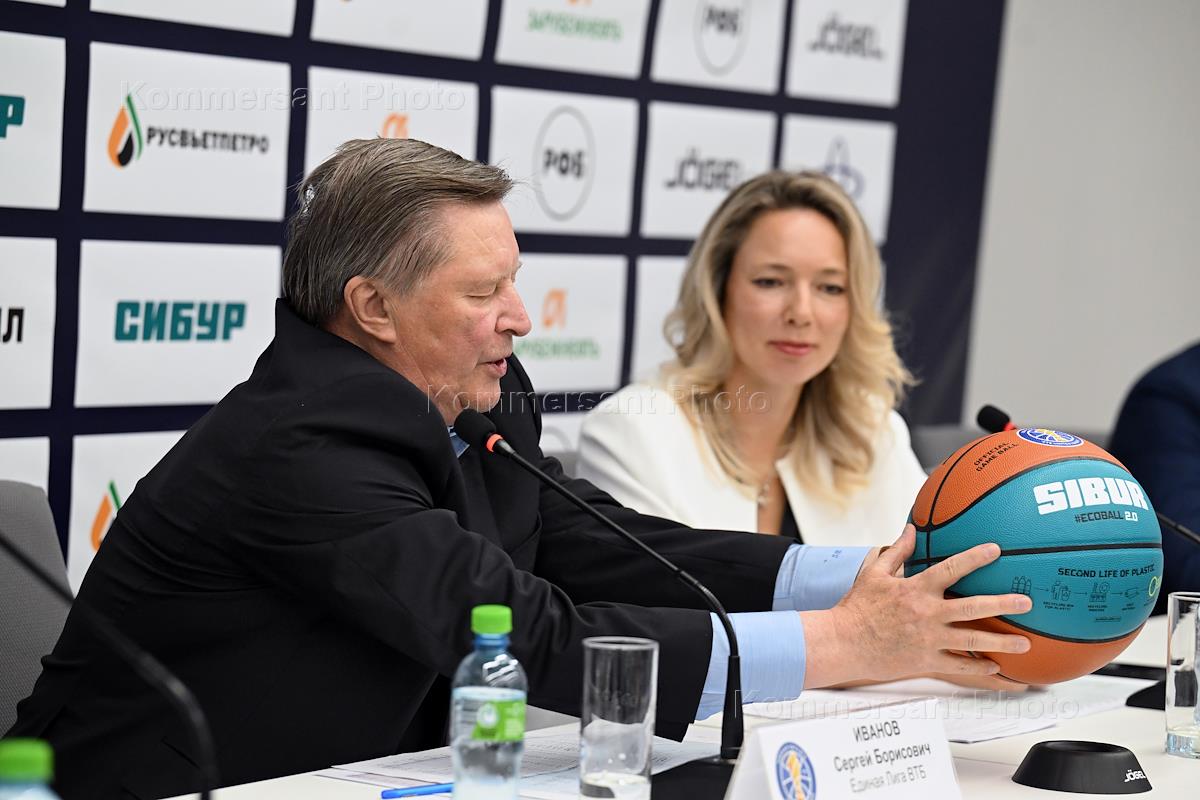 Пресс-конференция, посвященная открытию бюджетов клубов-участников Единой Лиги ВТБ сезона 2021/22, в спорткомплексе "ВТБ Арене". Почетный президент Единой Лиги ВТБ Сергей Иванов (слева) и генеральный директор Единой Лиги ВТБ Илона Корстин (справа) во время пресс-конференции.