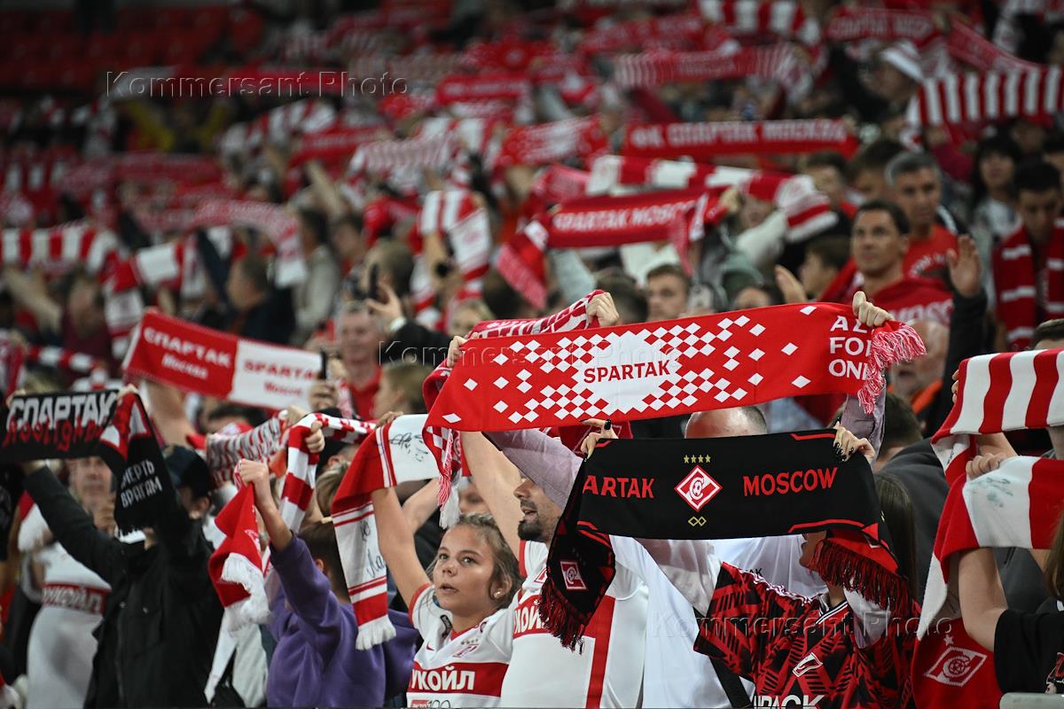 МИР Российская Премьер-Лига (РПЛ) 2023/2024. 9-й тур. Матч между командами "Спартак" (Москва) - "Динамо М" (Москва) на стадионе "Открытие Банк Арена". Болельщики команды "Спартак" на трибуне во время матча.