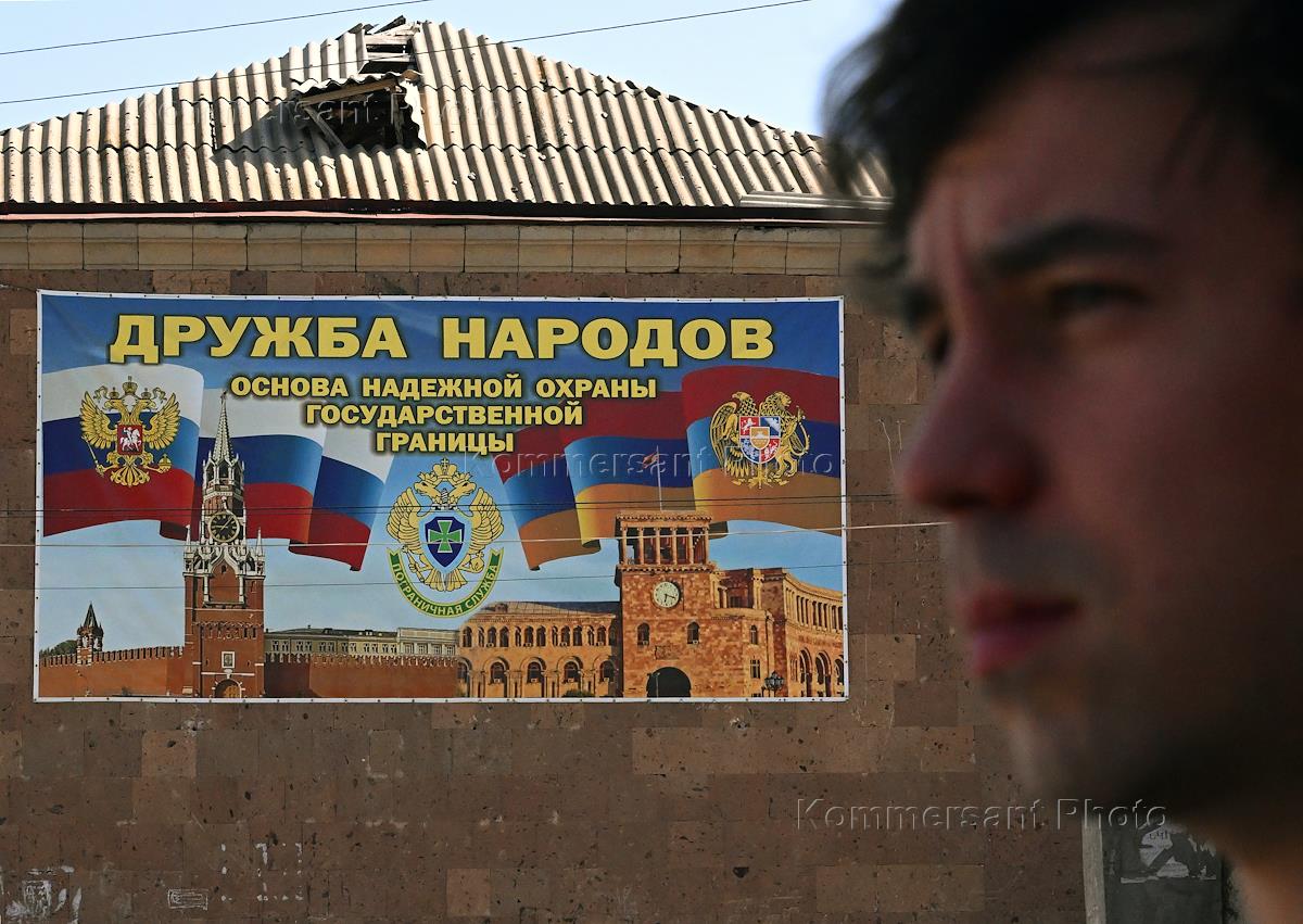 Виды Армении. Жанровая фотография. Плакат "Дружба народов основа надежной охраны государственной границы" с изображением Московского Кремля и Дома правительства Армении.