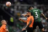 МИР Российская Премьер-Лига (РПЛ) 2023/2024. 9-й тур. Матч между командами "Краснодар" (Краснодар) - "Урал" (Екатеринбург) на стадионе "ФК Краснодар". Игрок команды "Урал" Гильерме Шеттине (в центре) и игрок команды "Краснодар" Витор Тормена (справа) во время матча.