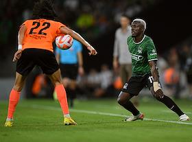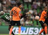 МИР Российская Премьер-Лига (РПЛ) 2023/2024. 9-й тур. Матч между командами "Краснодар" (Краснодар) - "Урал" (Екатеринбург) на стадионе "ФК Краснодар". Игрок команды "Урал" Мингиян Бевеев (слева) и игрок команды "Краснодар" Жоау Батчи (справа) во время матча.