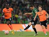 МИР Российская Премьер-Лига (РПЛ) 2023/2024. 9-й тур. Матч между командами "Краснодар" (Краснодар) - "Урал" (Екатеринбург) на стадионе "ФК Краснодар". Игрок команды "Урал" Мингиян Бевеев (второй слева) и игрок команды "Краснодар" Жоау Батчи (слева) во время матча.