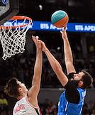 Суперкубок Единой лиги ВТБ по баскетболу на кубок имени А.Я.Гомельского. Финал. Матч между командами "Локомотив-Кубань" (Краснодар) - "Зенит" (Санкт-Петербург) с спорткомплексе "ВТБ Арене". Игрок команды "Локомотив-Кубань" Владислав Близнюк (слева) и игрок команды "Зенит" Томас Эртель (справа) во время матча.