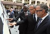 Церемония открытия выставки, посвящённой 80-летию установления дипломатических отношений между Россией и Египтом в корпусе 1 Министерства иностранных дел (МИД) России. Жанровая фотография. Чрезвычайный и полномочный посол Арабской Республики Египет Назих Эль Нагари (второй справа) во время осмотра выставки.