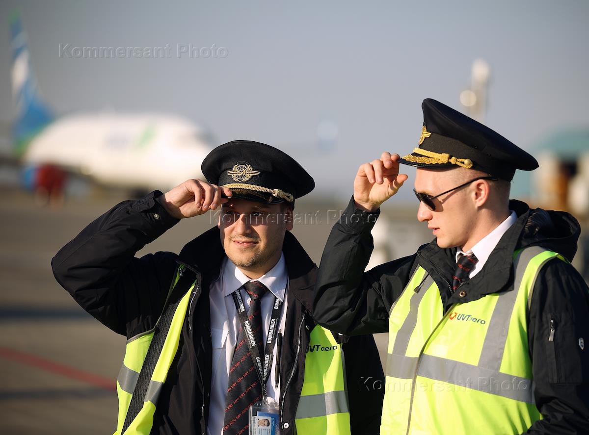 Встреча первого прямого рейса по маршруту Казань - Самарканд - Казань в международном аэропорту "Казань" имени Габдуллы Тукая. Жанровая фотография. Сотрудники аэропорта на летном поле.