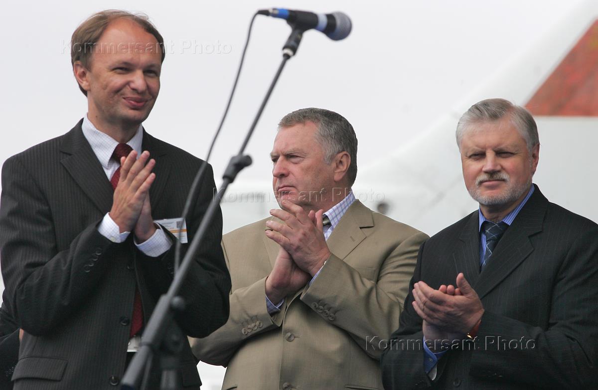 Лидер Либерально-демократической партии России, заместитель председателя Государственной Думы России Владимир Жириновский (в центре), председатель Совета Федерации России Сергей Миронов (справа) и руководитель Федерального агентства по печати и массовым коммуникациям (ФАПМК) России Михаил Сеславинский (слева) на церемонии открытия XIX Московской международной книжной выставки-ярмарки на территории Всероссийского Выставочного Центра (ВВЦ).