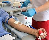 Акция "День донора" в рамках проекта "Агрегатор решений антикризисного управления в сфере донорства крови и костного мозга" в музее-заповеднике "Коломенское". Участник акции во время забора крови в передвижном пункте.