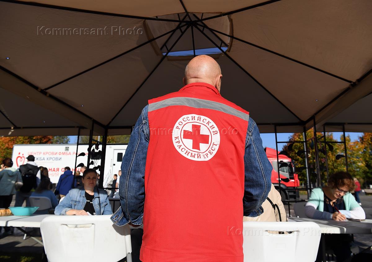 Акция "День донора" в рамках проекта "Агрегатор решений антикризисного управления в сфере донорства крови и костного мозга" в музее-заповеднике "Коломенское". Жанровая фотография. Сотрудник Российского Красного креста у передвижного пункта сдачи крови.