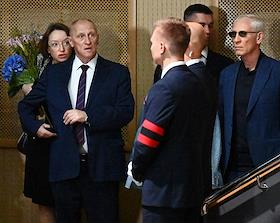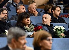 Церемония прощания с бывшим министром экономики России, членом Совета по правам человека (СПЧ) Евгением Ясиным в здании НИУ "Высшая школа экономики". Телеведущая Марианна Максимовская (вторая слева) и журналист, продюсер и медиаменеджер Василий Борисов (справа) на церемонии.
