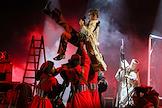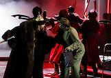 Пресс-показ спектакля "Иван Васильевич" режиссера Сергея Газарова в Московском академическом Театре сатиры. Актеры Юрий Васильев в роли управдома Бунши-Корецкого / Иоанна Грозного (слева) и Артем Минин в роли Жоржа Милославского (справа) во время спектакля.