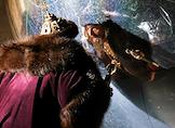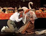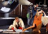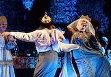 Пресс-показ спектакля "Иван Васильевич" режиссера Сергея Газарова в Московском академическом Театре сатиры. Актеры Юрий Васильев в роли управдома Бунши-Корецкого / Иоанна Грозного (слева) и Надежда Филиппова в роли царицы (справа) во время спектакля.