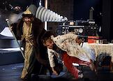Пресс-показ спектакля "Иван Васильевич" режиссера Сергея Газарова в Московском академическом Театре сатиры. Актеры Юрий Васильев в роли управдома Бунши-Корецкого / Иоанна Грозного (слева) и Илья Малаков в роли изобретателя Тимофеева (справа) во время спектакля.