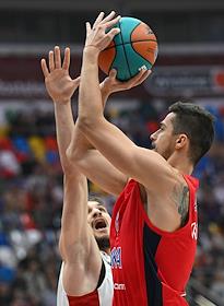 Единая лига ВТБ по баскетболу. Матч между командам ЦСКА (Москва) - МБА (Москва) на спортивной арене "Мегаспорт". Игрок команды ЦСКА Антон Астапкович (справа) и игрок команды МБА Сергей Клюев (слева) во время матча.