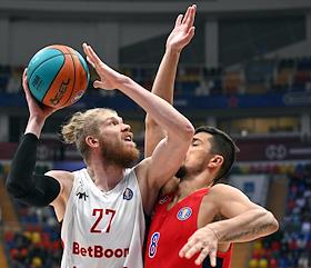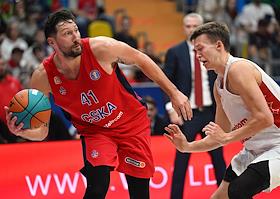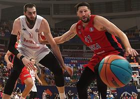 Единая лига ВТБ по баскетболу. Матч между командам ЦСКА (Москва) - МБА (Москва) на спортивной арене "Мегаспорт". Игрок команды ЦСКА Антон Астапкович (справа) во время матча.