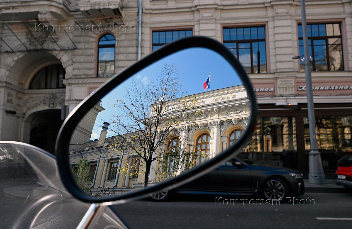 Виды Москвы. Улица Неглинная. Жанровая фотография. Отражение здания Центрального Банка России в зеркале мотоцикла.