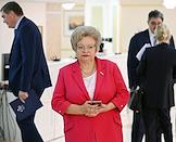 Парламентские слушания "О параметрах проекта федерального бюджета на 2024 год и на плановый период 2025 и 2026 годов" в Совете Федерации (СФ) России. Исполняющая обязанности председателя Счетной палаты России Галина Изотова (в центре) перед началом слушаний.