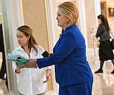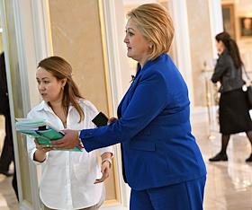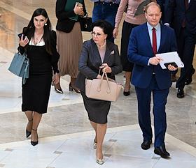 Парламентские слушания "О параметрах проекта федерального бюджета на 2024 год и на плановый период 2025 и 2026 годов" в Совете Федерации (СФ) России. Представитель в СФ России от исполнительного органа государственной власти Республики Башкортостан Лилия Гумерова (справа) перед началом слушаний.