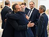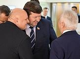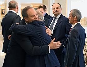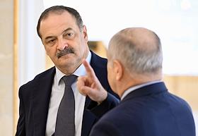 Парламентские слушания "О параметрах проекта федерального бюджета на 2024 год и на плановый период 2025 и 2026 годов" в Совете Федерации России. Глава Республики Дагестан Сергей Меликов (второй справа) перед началом слушаний.