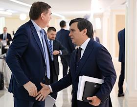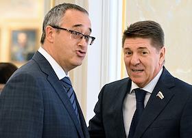 Парламентские слушания "О параметрах проекта федерального бюджета на 2024 год и на плановый период 2025 и 2026 годов" в Совете Федерации России. Представитель в СФ России от законодательного (представительного) органа государственной власти Оренбургской области Андрей Шевченко (справа) и председатель Московской городской думы Алексей Шапошников (слева) перед началом слушаний.