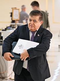 Парламентские слушания "О параметрах проекта федерального бюджета на 2024 год и на плановый период 2025 и 2026 годов" в Совете Федерации (СФ) России. Представитель в СФ России от законодательного (представительного) органа государственной власти Еврейской автономной области Владимир Джабаров перед началом слушаний.