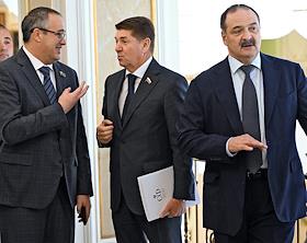Парламентские слушания "О параметрах проекта федерального бюджета на 2024 год и на плановый период 2025 и 2026 годов" в Совете Федерации России. Справа налево: глава Республики Дагестан Сергей Меликов, представитель в СФ России от законодательного (представительного) органа государственной власти Оренбургской области Андрей Шевченко и председатель Московской городской думы Алексей Шапошников перед началом слушаний.