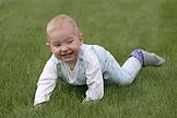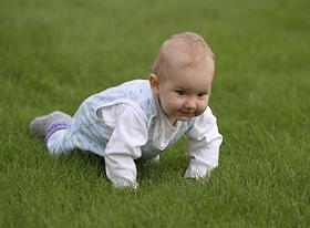 Народные гулянья на День города. Маленький ребенок ползает по газону на Манежной площади.