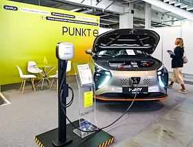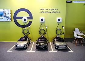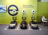 International construction forum and exhibition 100+ TechnoBuild at the Ekaterinburg-Expo exhibition center. Genre photography. Electric vehicle charging place.